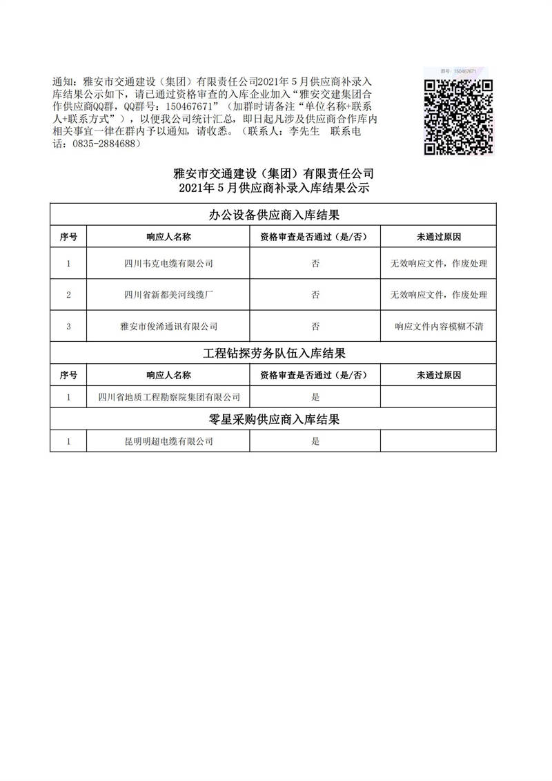 雅安市交通建設(shè)(集團(tuán))有限責(zé)任公司2021年5月供應(yīng)商補(bǔ)錄入庫結(jié)果公示