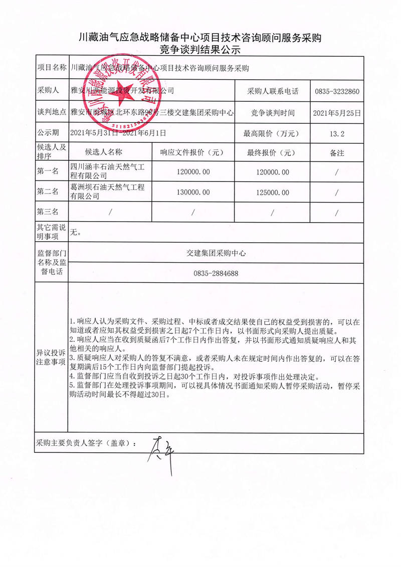 雅安川西能源投資開發(fā)有限公司川藏油氣應(yīng)急戰(zhàn)略儲備中心項目技術(shù)咨詢顧問服務(wù)采購競爭談判結(jié)果公示
