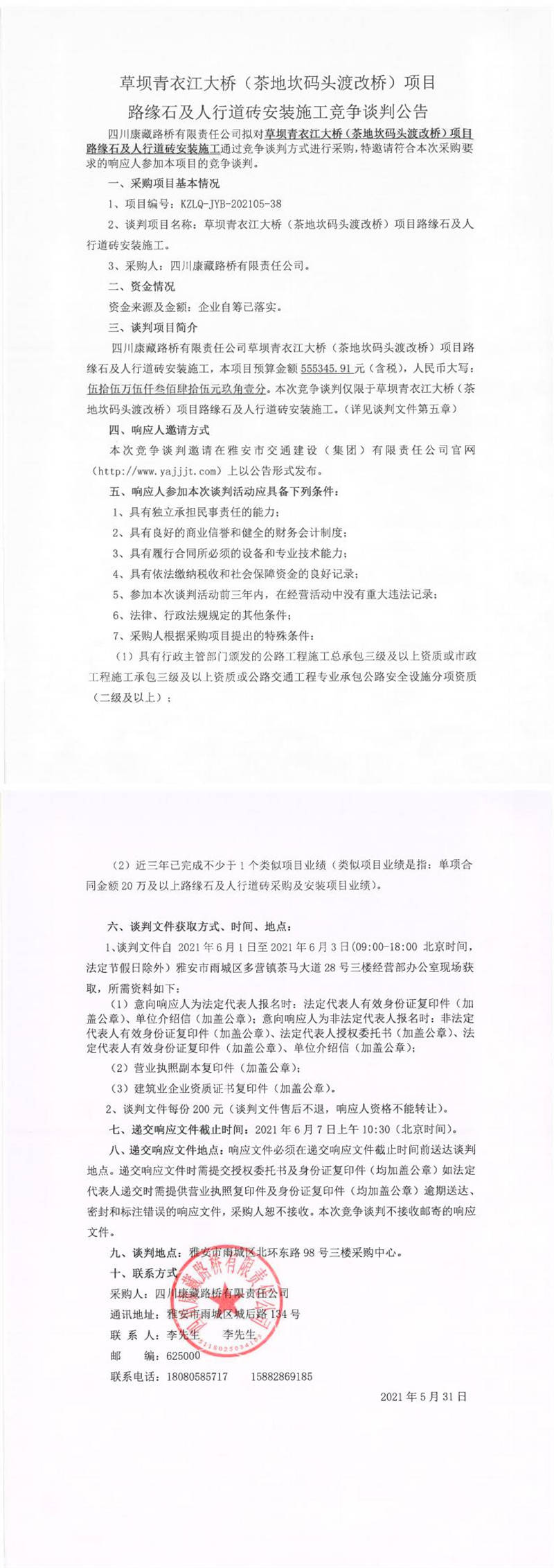 四川康藏路橋有限責(zé)任公司草壩青衣江大橋(茶地坎碼頭渡改橋)項(xiàng)目路緣石及人行道磚安裝施工競(jìng)爭(zhēng)談判公告