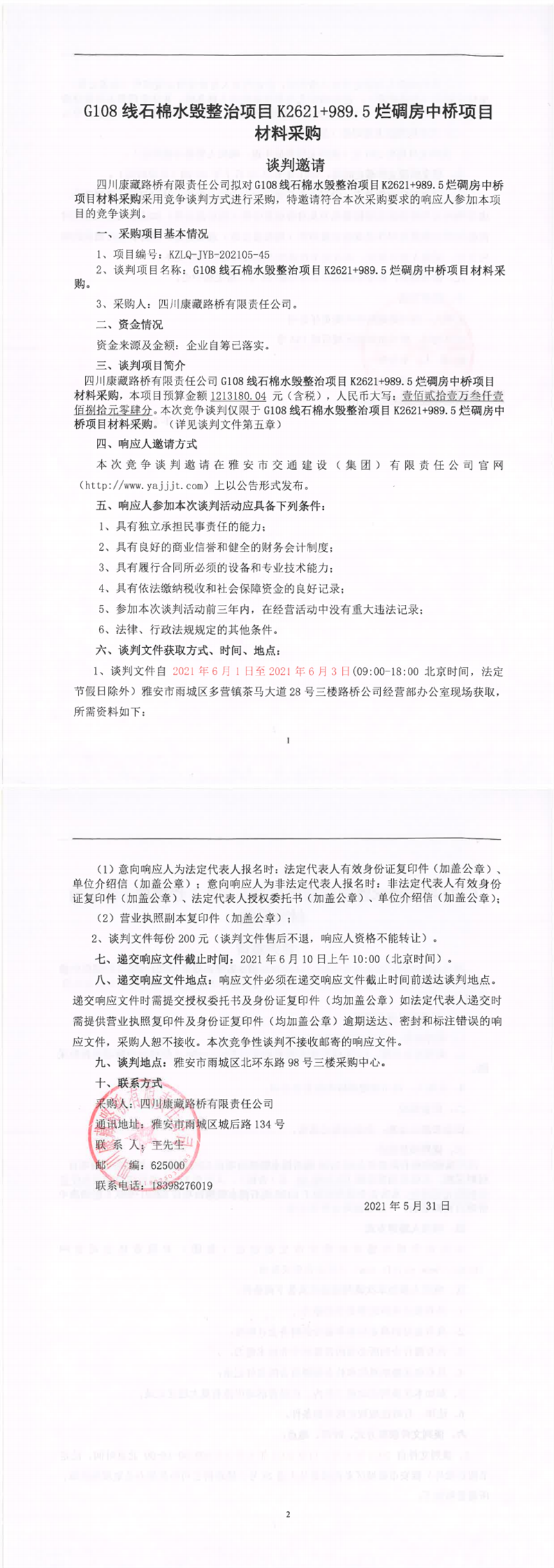 四川康藏路橋有限責(zé)任公司G108線(xiàn)石棉水毀整治項(xiàng)目K2621+989.5爛碉房中橋項(xiàng)目材料采購(gòu)競(jìng)爭(zhēng)談判公告