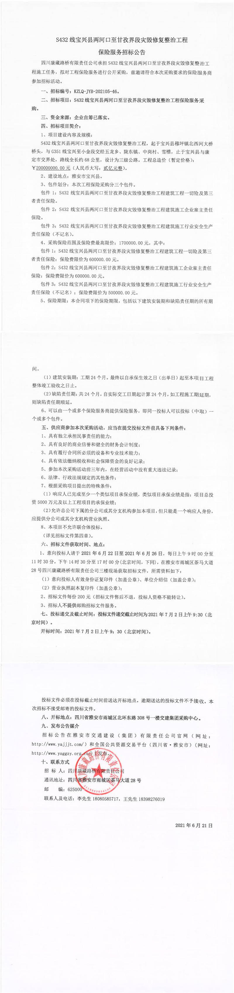 四川康藏路橋有限責(zé)任公司S432線寶興縣兩河口至甘孜界段災(zāi)毀修復(fù)整治工程保險服務(wù)招標公告