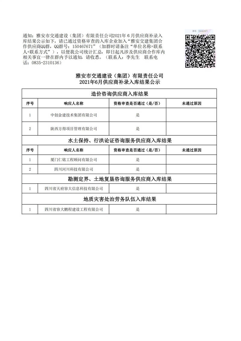 雅安市交通建設(shè)(集團)有限責(zé)任公司2021年6月供應(yīng)商補錄入庫結(jié)果公示