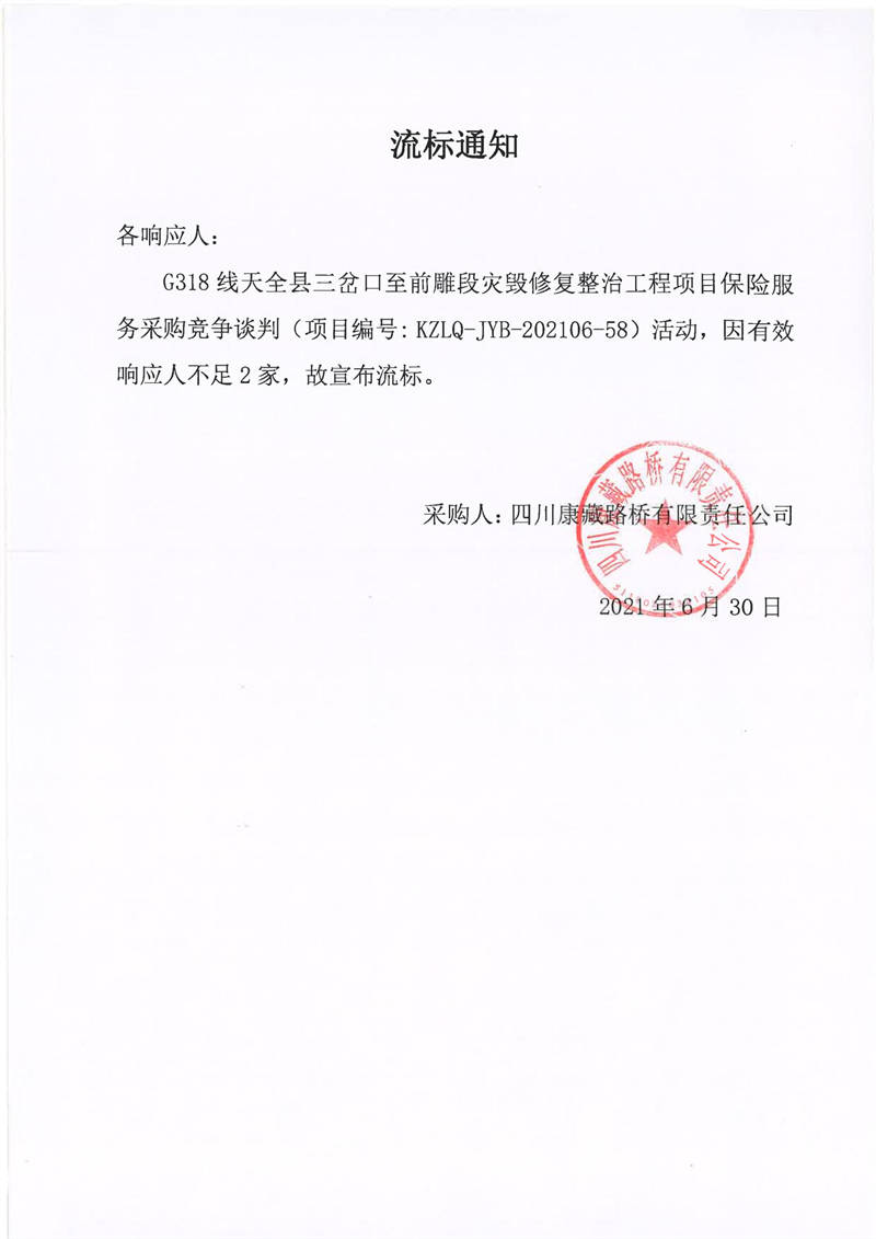 四川康藏路橋有限責(zé)任公司G318線天全縣三岔口至前雕段災(zāi)毀修復(fù)整治工程項目保險服務(wù)采購流標(biāo)通知