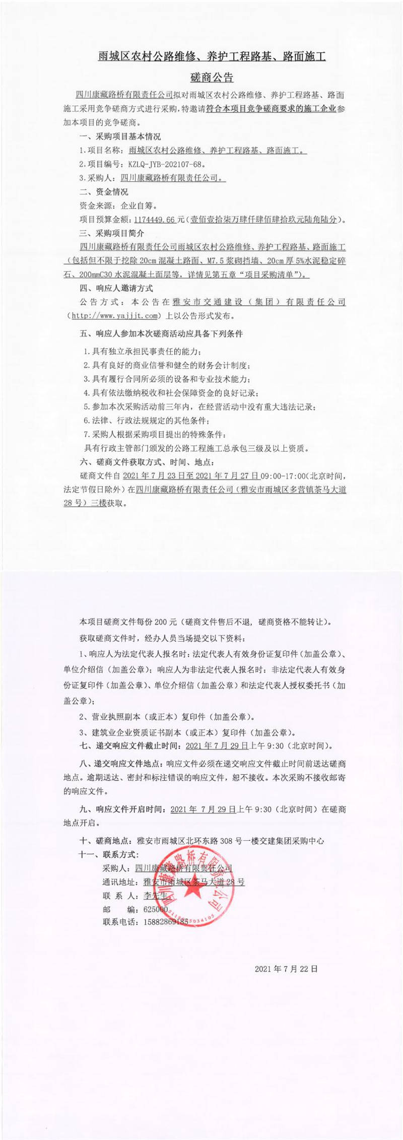 四川康藏路橋有限責任公司雨城區(qū)農村公路維修、養(yǎng)護工程路基、路面施工磋商公告
