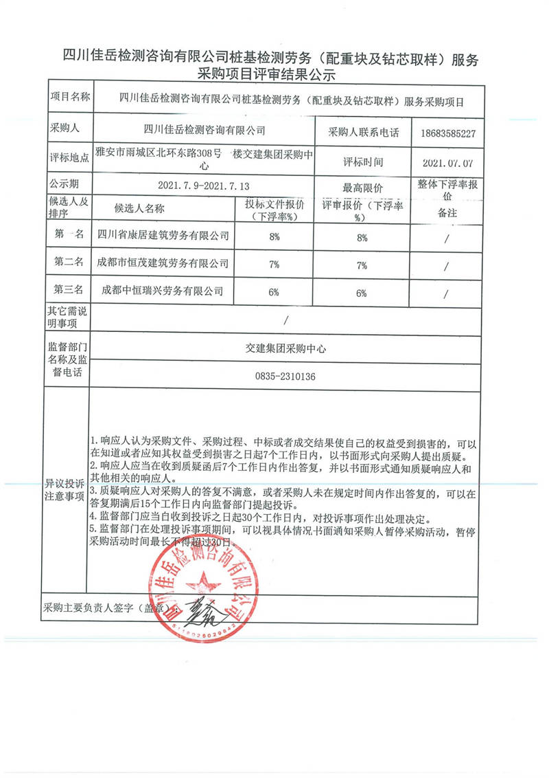 四川佳岳檢測咨詢有限公司樁基檢測勞務(wù)(配重塊及鉆芯取樣)服務(wù)采購項(xiàng)目評審結(jié)果公示