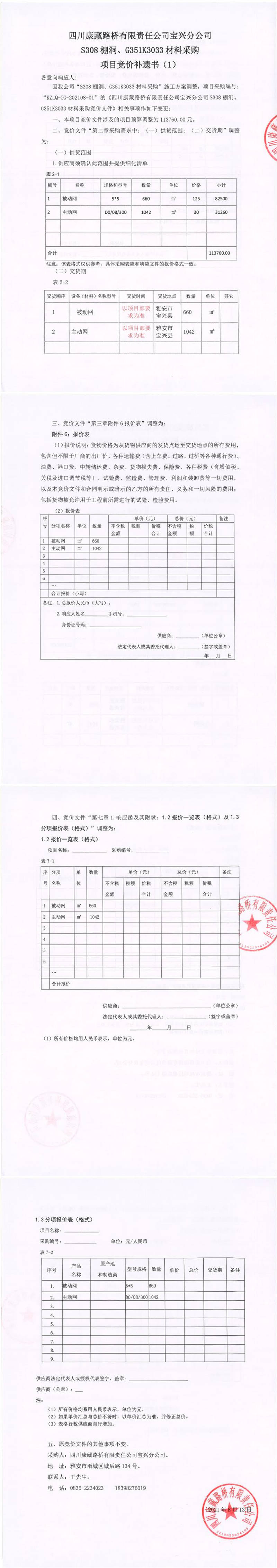 四川康藏路橋有限責(zé)任公司寶興分公司S308棚洞、G351K3033材料采購項目競價補(bǔ)遺書(1)