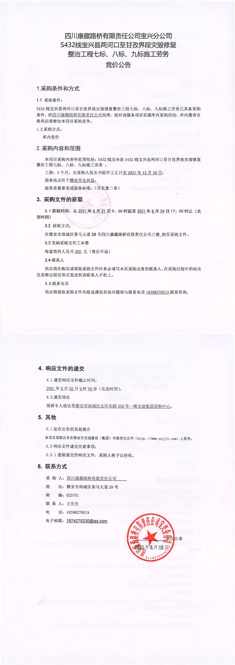 四川康藏路橋有限責(zé)任公司寶興分公司S432線寶興縣兩河口至甘孜界段災(zāi)毀修復(fù)整治工程七標(biāo)、八標(biāo)、九標(biāo)施工勞務(wù)競(jìng)價(jià)公告
