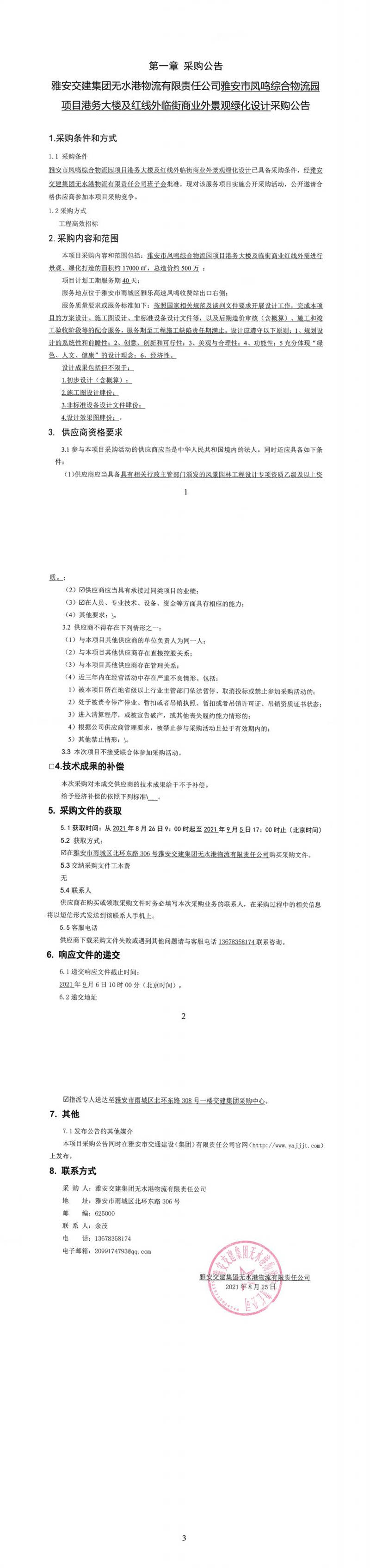 雅安交建集團無水港物流有限責(zé)任公司雅安市鳳鳴綜合物流園項目港務(wù)大樓及紅線外臨街商業(yè)外景觀綠化設(shè)計采購公告