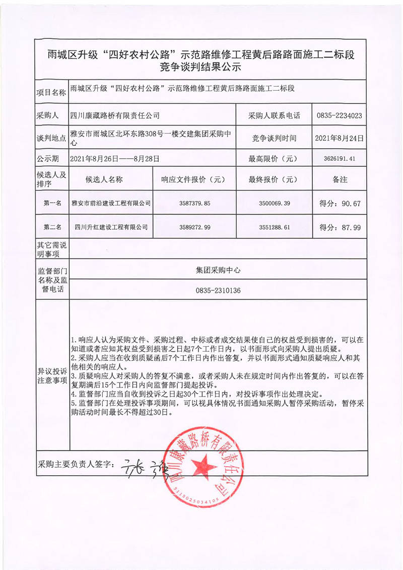 四川康藏路橋有限責(zé)任公司雨城區(qū)升級“四好農(nóng)材公路”示范路維修工程黃后路路面施工二標段競爭談判結(jié)果公示