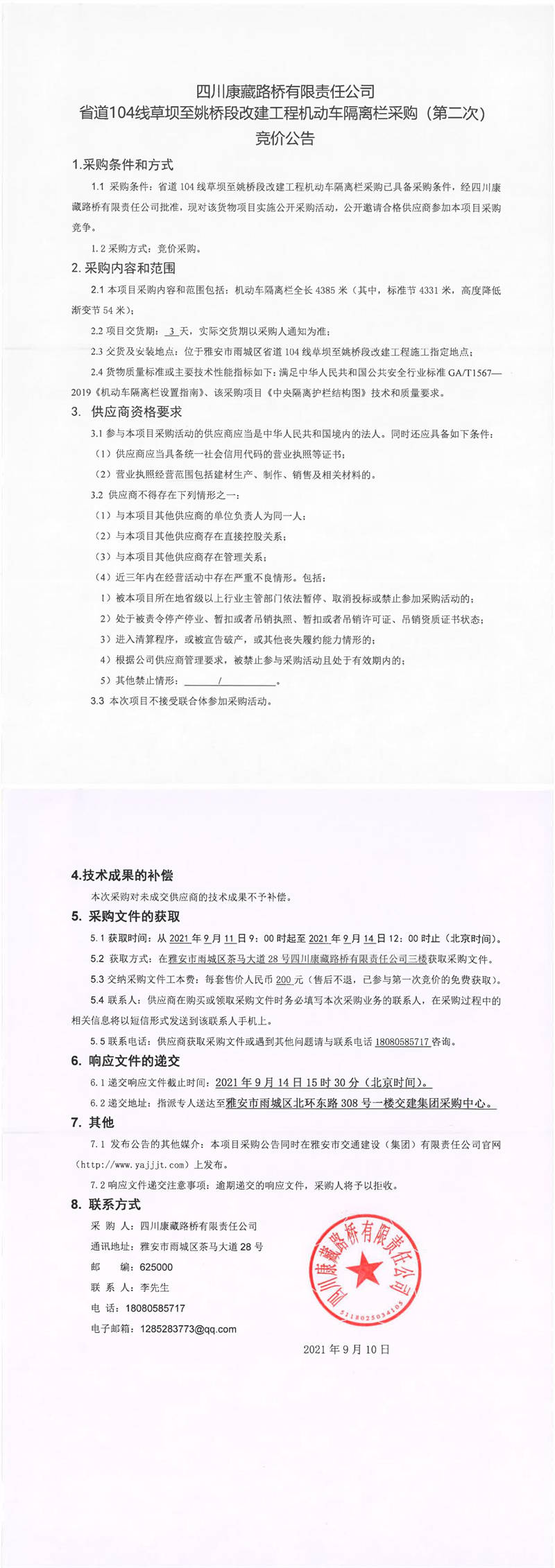 四川康藏路橋有限責(zé)任公司省道104線草壩至姚橋段改建工程機(jī)動(dòng)車隔離欄采購(gòu)(第二次)競(jìng)價(jià)公告