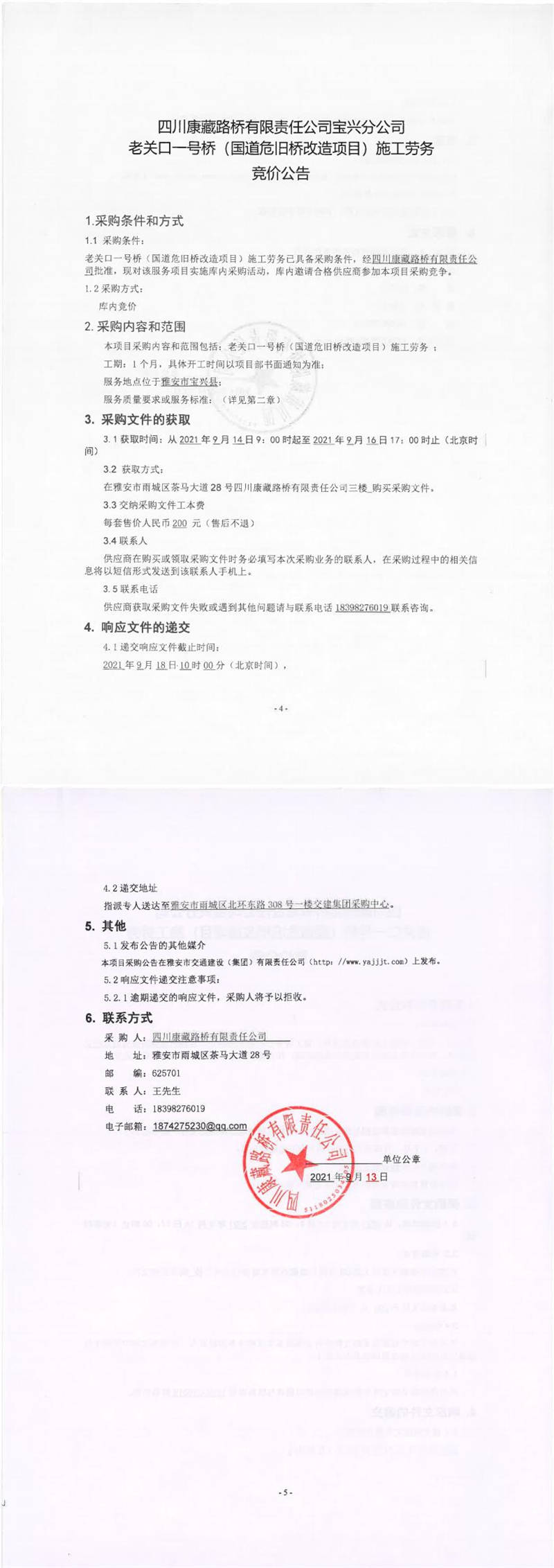 四川康藏路橋有限責任公司寶興分公司老關口一號橋(國道危舊橋改造項目)施工勞務競價公告