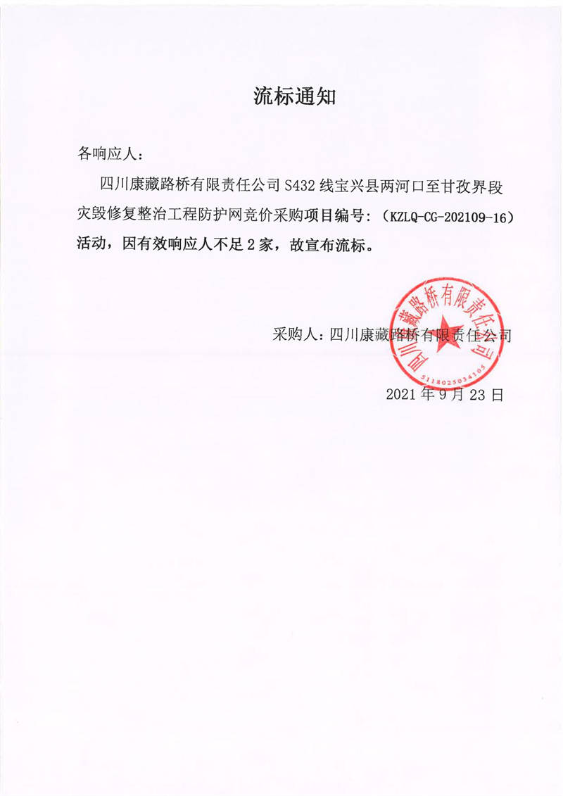 四川康藏路橋有限責任公司S432線寶興縣兩河口至甘孜界段災毀修復整治工程防護網采購流標通知