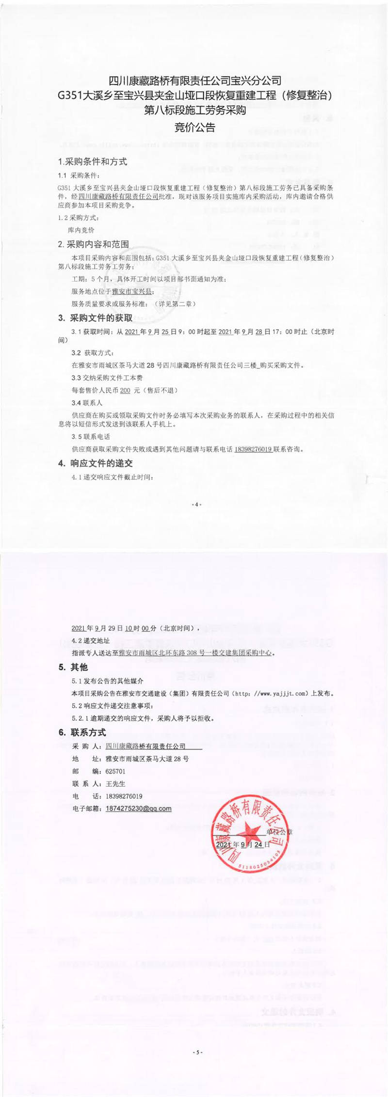 四川康藏路橋有限責(zé)任公司寶興分公司G351大溪鄉(xiāng)至寶興縣夾金山埡口段恢復(fù)重建工程(修復(fù)整治)第八標(biāo)段施工勞務(wù)采購(gòu)競(jìng)價(jià)公告