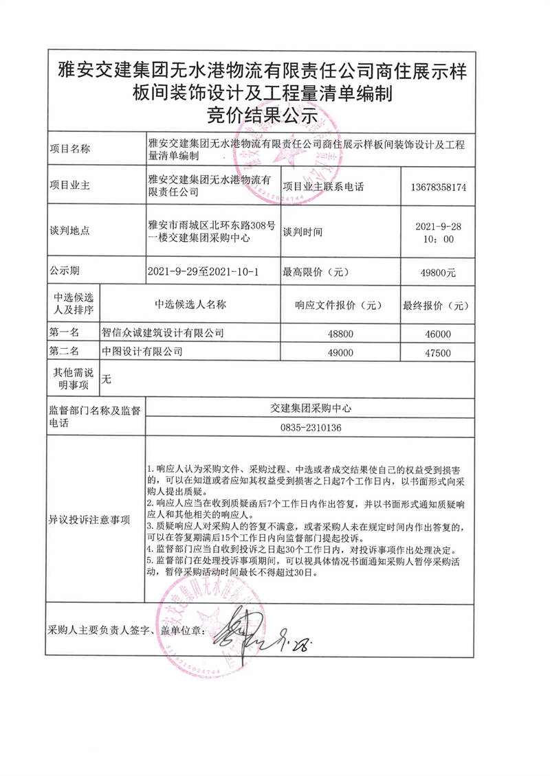 雅安交建集團(tuán)無(wú)水港物流有限責(zé)任公司商住展示樣板間裝飾設(shè)計(jì)及工程量清單編制競(jìng)價(jià)結(jié)果公示