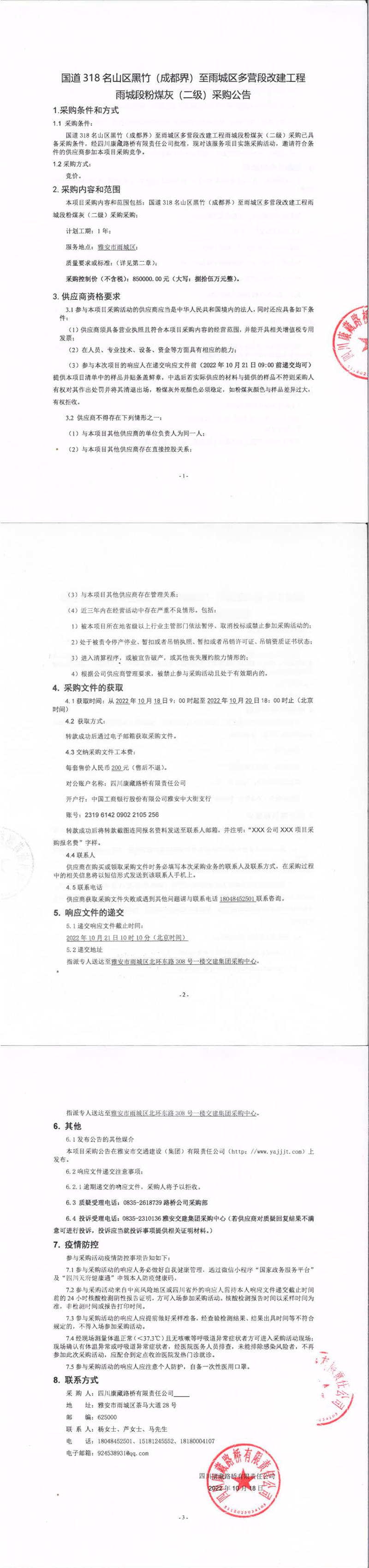 四川康藏路橋有限責(zé)任公司國(guó)道318名山區(qū)黑竹(成都界)至雨城區(qū)多營(yíng)段改建工程雨城段粉煤灰(二級(jí))采購(gòu)公告