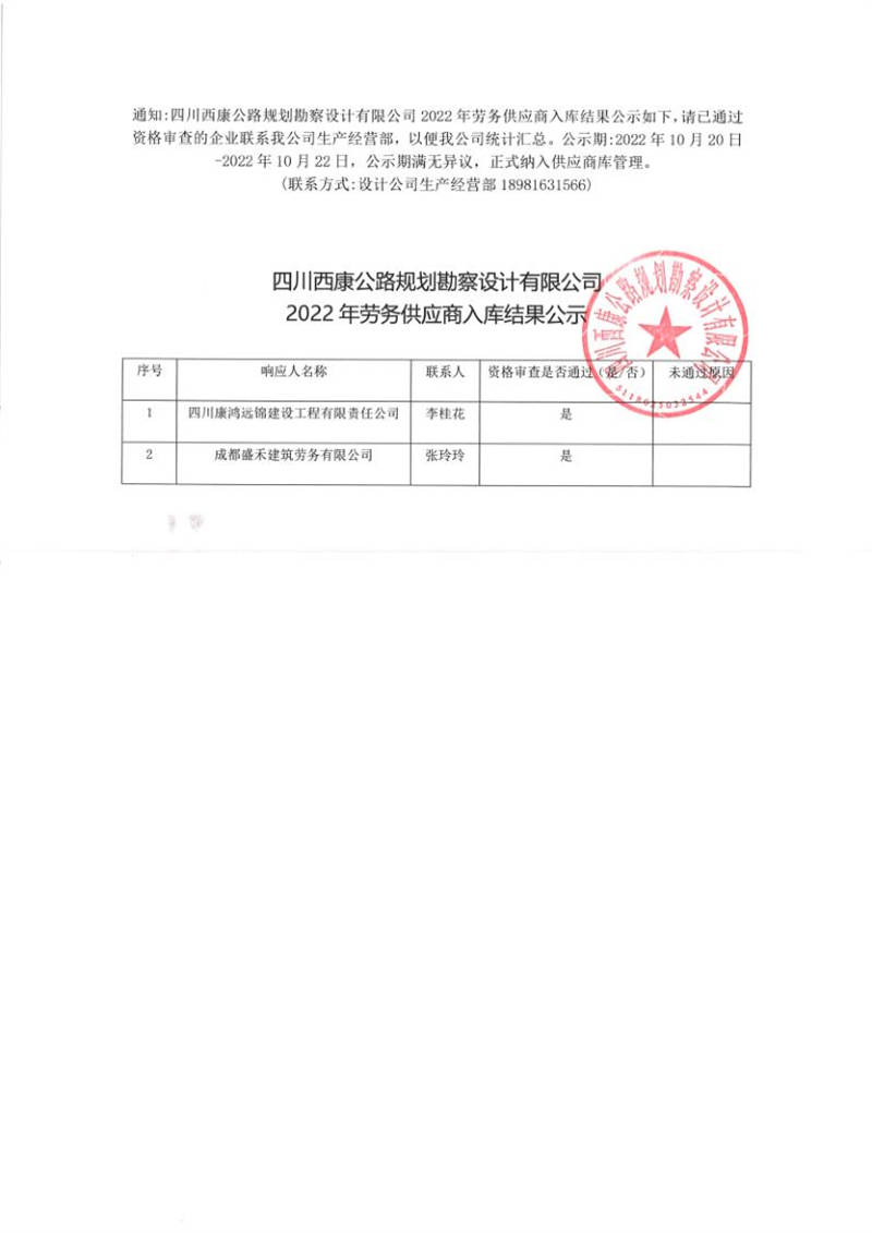 四川西康公路規(guī)劃勘察設(shè)計(jì)有限公司2022年勞務(wù)供應(yīng)商入庫(kù)結(jié)果公示