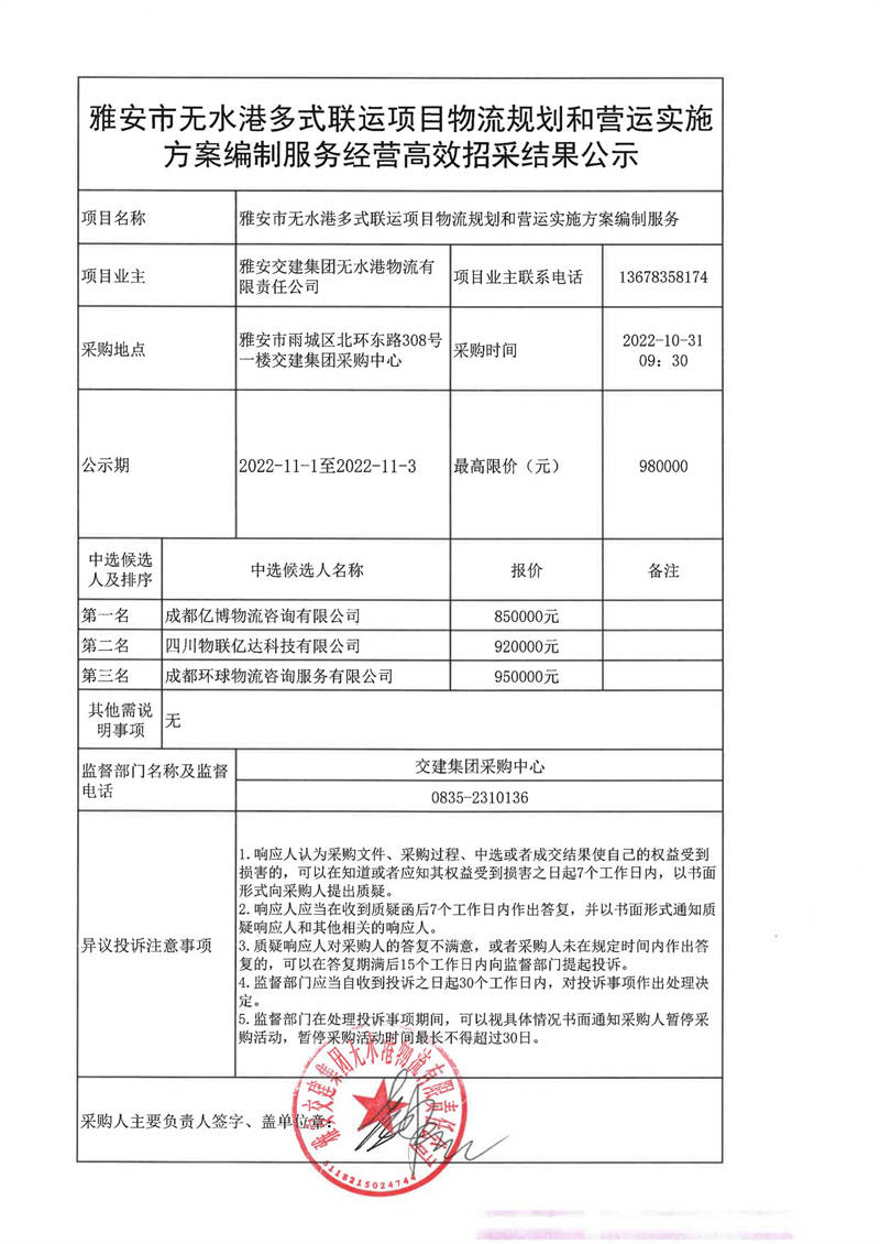 雅安交建集團(tuán)無(wú)水港物流有限責(zé)任公司雅安市無(wú)水港多式聯(lián)運(yùn)項(xiàng)目物流規(guī)劃和營(yíng)運(yùn)實(shí)施方案編制服務(wù)經(jīng)營(yíng)高效招采結(jié)果公示