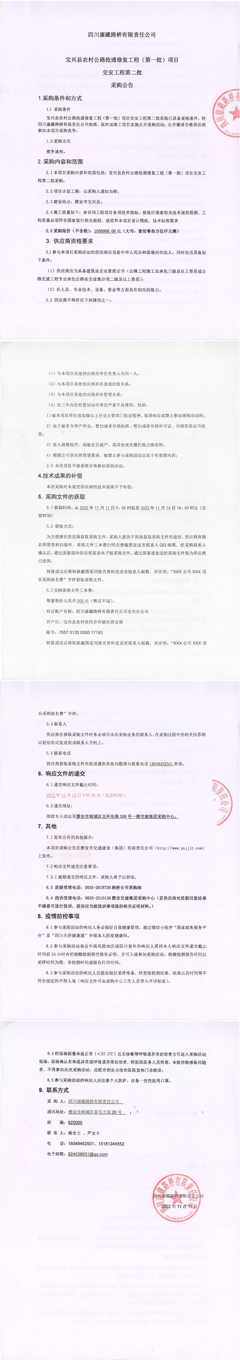 四川康藏路橋有限責任公司寶興縣農村公路搶通修復工程(第一批)項目交安工程第二批采購公告