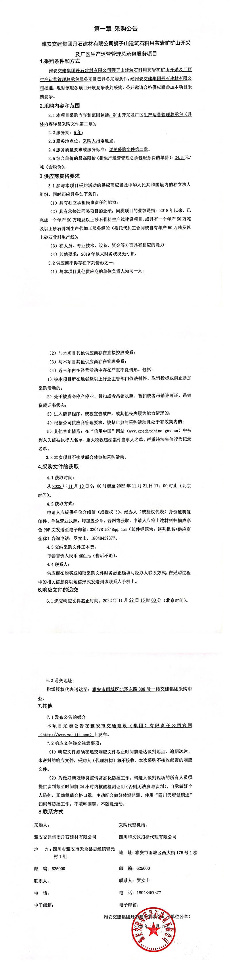 雅安交建集團丹石建材有限公司獅子山建筑石料用灰?guī)r礦礦山開采及廠區(qū)生產(chǎn)運營管理總承包服務(wù)項目采購公告