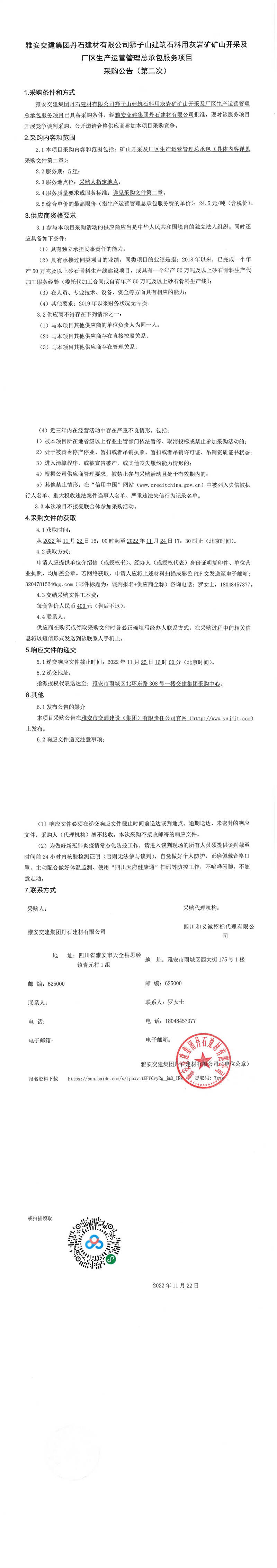 雅安交建集團(tuán)丹石建材有限公司獅子山建筑石料用灰?guī)r礦礦山開采及廠區(qū)生產(chǎn)運(yùn)營(yíng)管理總承包服務(wù)項(xiàng)目采購(gòu)公告(第二次)