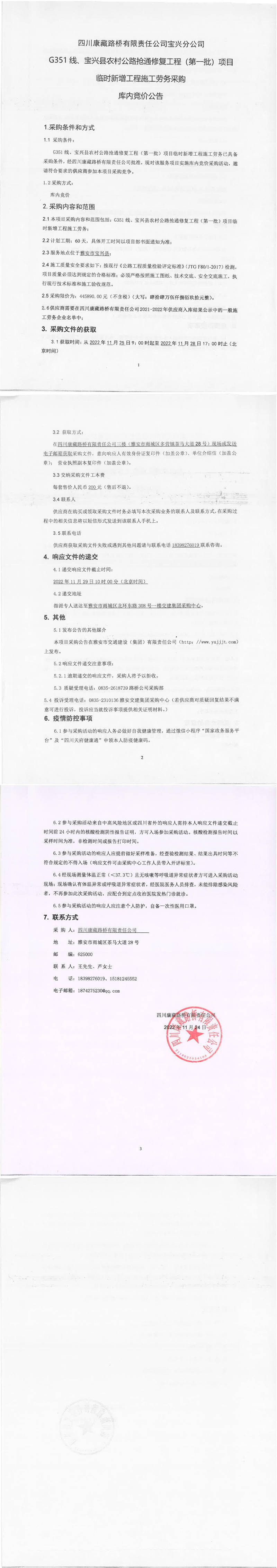 四川康藏路橋有限責任公司G351線、寶興縣農(nóng)村公路搶通修復工程(第一批)項目臨時新增工程施工勞務采購庫內(nèi)競價公告