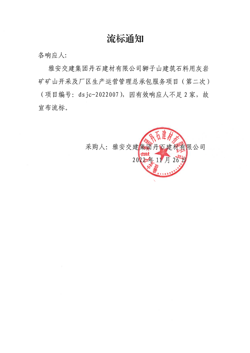 雅安交建集團(tuán)丹石建材有限公司獅子山建筑石料用灰?guī)r礦礦山開采及廠區(qū)生產(chǎn)運營管理總承包服務(wù)項目(第二次)流標(biāo)通知