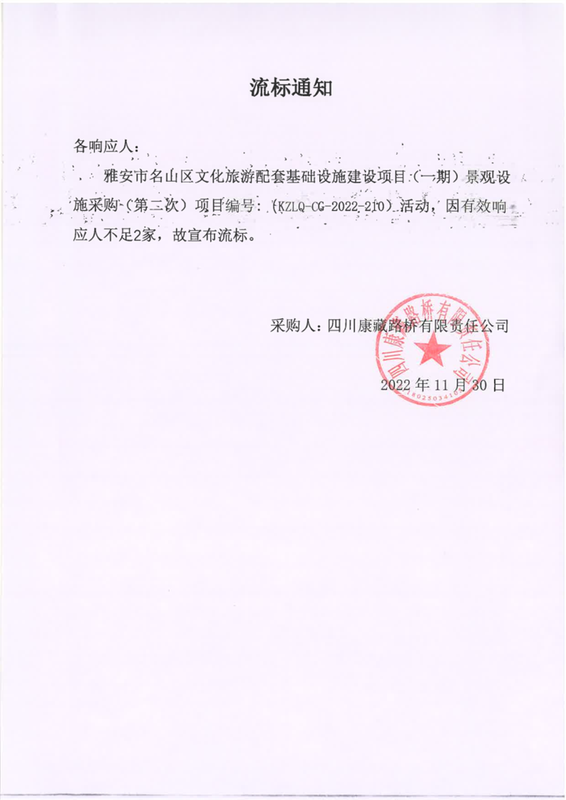 四川康藏路橋有限責(zé)任公司雅安市名山區(qū)文化旅游配套基礎(chǔ)設(shè)施建設(shè)項目(一期)景觀設(shè)施采購(第二次)流標(biāo)通知