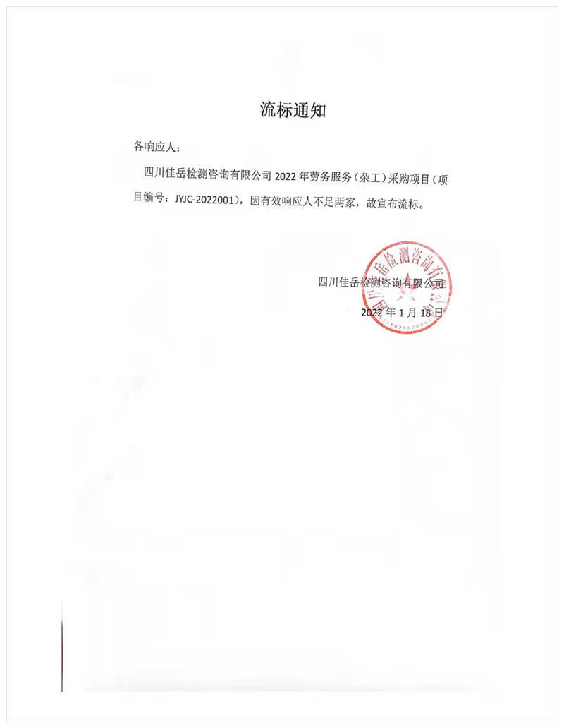四川佳岳檢測咨詢有限公司2022年勞務(wù)服務(wù)(雜工)采購項(xiàng)目流標(biāo)通知