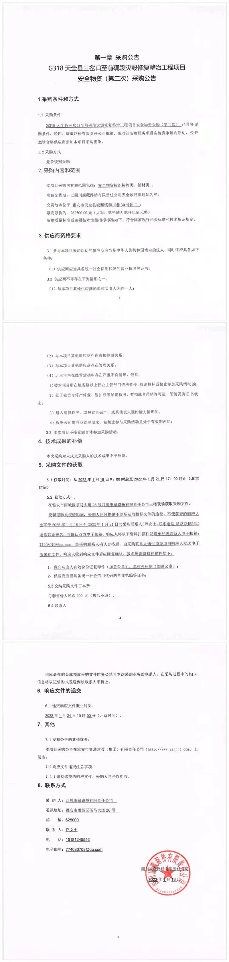 四川康藏路橋有限責(zé)任公司G318天全縣三岔口至前碉段災(zāi)毀修復(fù)整治工程項(xiàng)目安全物資(第二次)采購公告