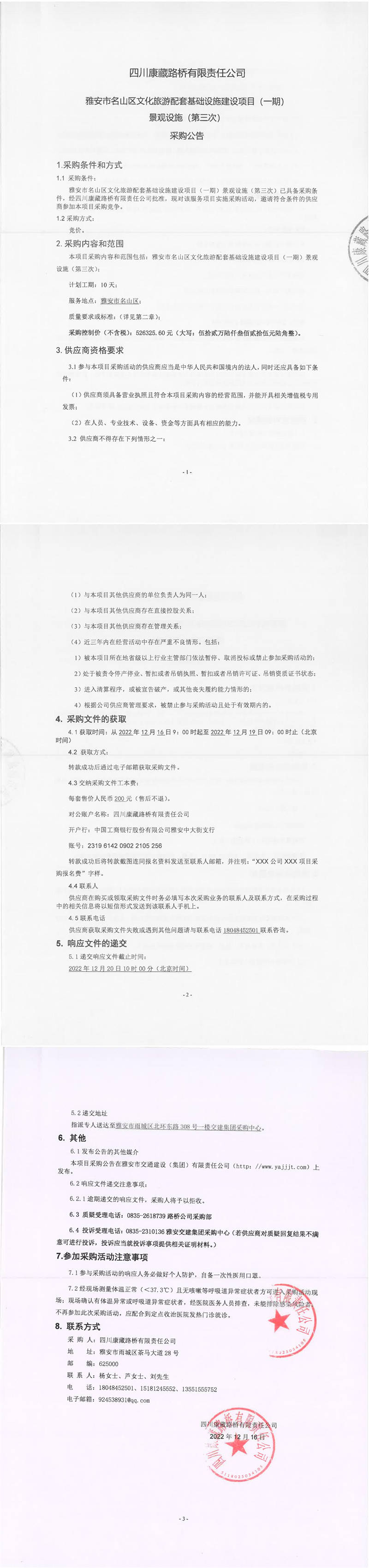 四川康藏路橋有限責(zé)任公司雅安市名山區(qū)文化旅游配套基礎(chǔ)設(shè)施建設(shè)項(xiàng)目(一期)景觀設(shè)施(第三次)采購公告