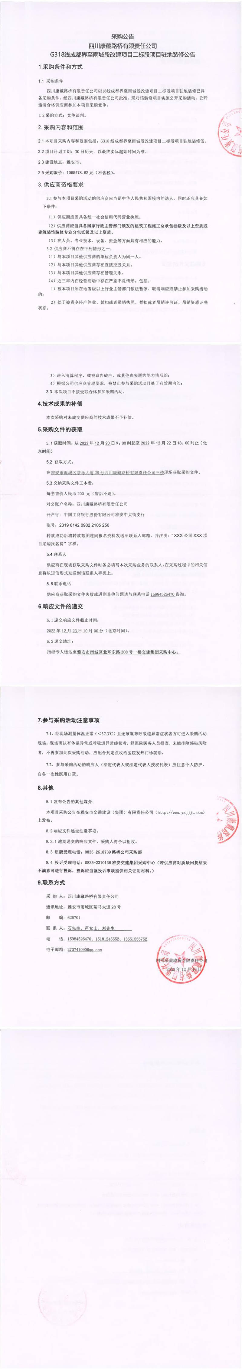 四川康藏路橋有限責(zé)任公司G318線成都界至雨城段改建項(xiàng)目二標(biāo)段項(xiàng)目駐地裝修采購公告
