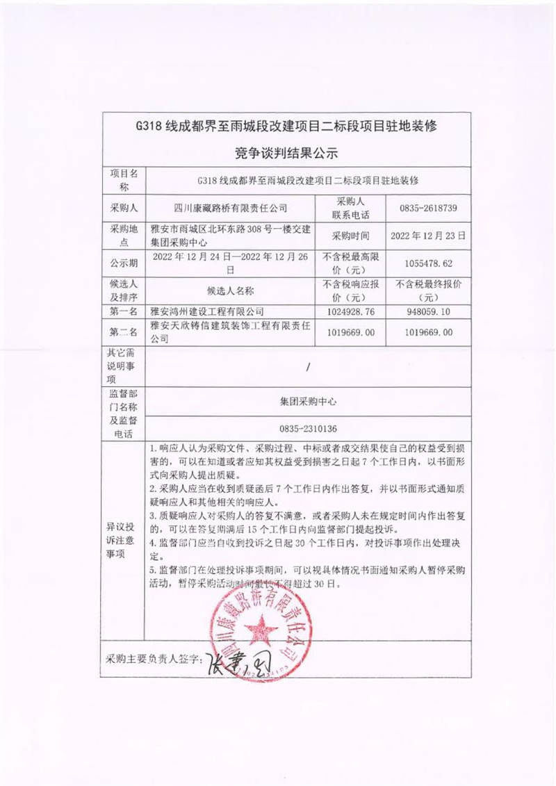 四川康藏路橋有限責(zé)任公司G318線成都界至雨城段改建項目二標(biāo)段項目駐地裝修競爭談判結(jié)果公示