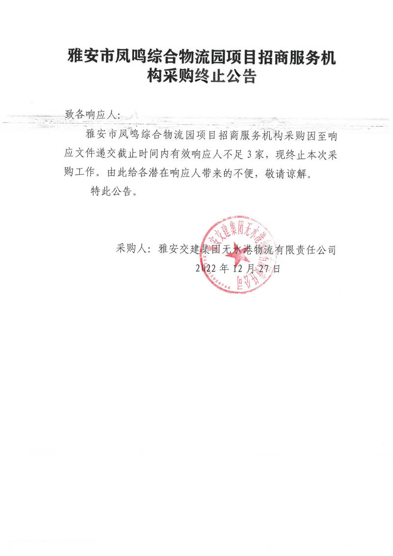 雅安交建集團(tuán)無水港物流有限責(zé)任公司雅安市鳳鳴綜合物流園項(xiàng)目招商服務(wù)機(jī)構(gòu)采購終止公告