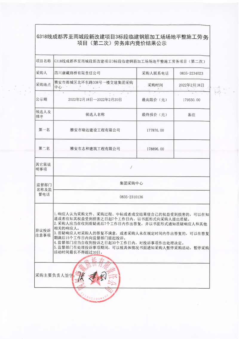 四川康藏路橋有限責(zé)任公司G318線成都界至雨城段新改建項目3標(biāo)段臨建鋼筋加工場場地平整施工勞務(wù)(第二次)庫內(nèi)競價結(jié)果公示
