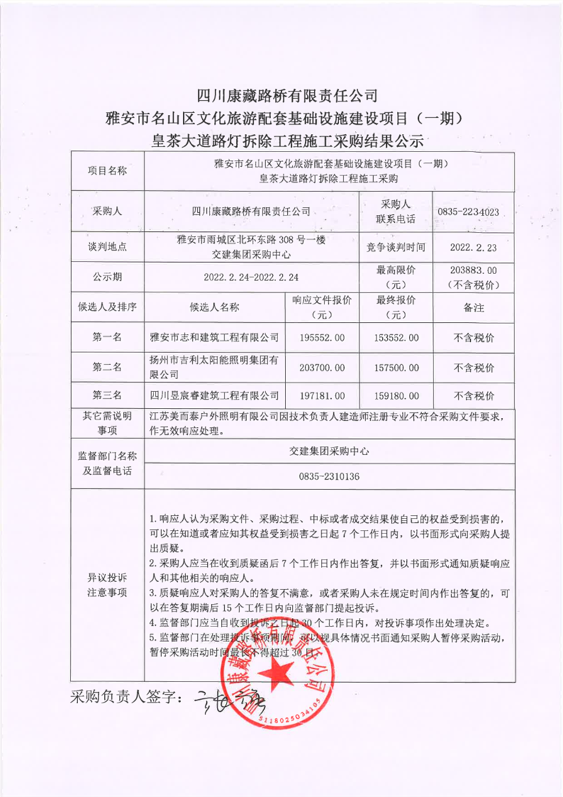 四川康藏路橋有限責任公司雅安市名山區(qū)文化旅游配套基礎(chǔ)設(shè)施建設(shè)項目(一期)皇茶大道路燈拆除工程施工采購結(jié)果公示