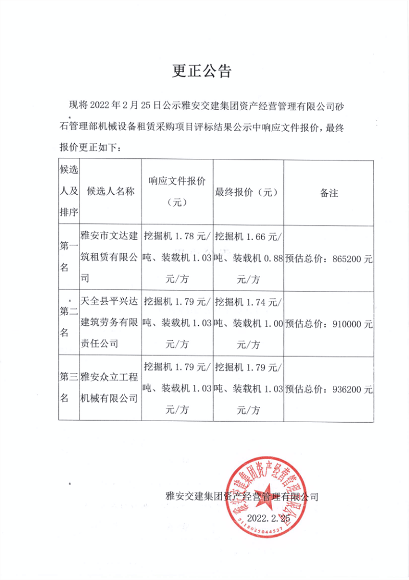 雅安交建集團資產(chǎn)經(jīng)營管理有限公司砂石管理部機械設(shè)備租賃采購項目評標結(jié)果公示更正公告