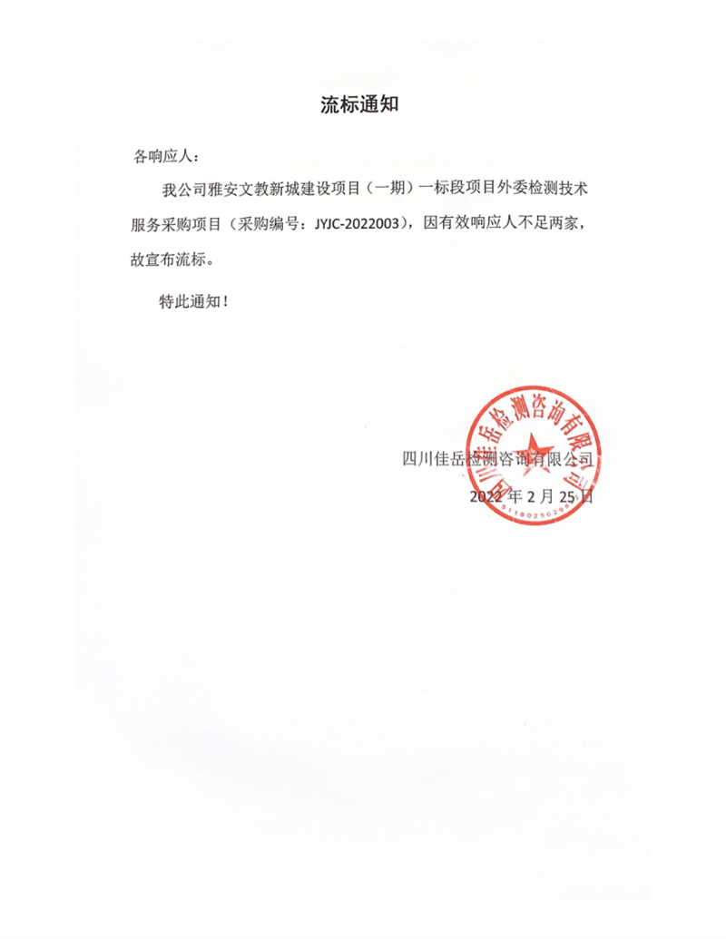 四川佳岳檢測咨詢有限公司雅安文教新城國際社區(qū)蜀天星辰項目(一期)外委檢測服務(wù)采購項目流標(biāo)通知