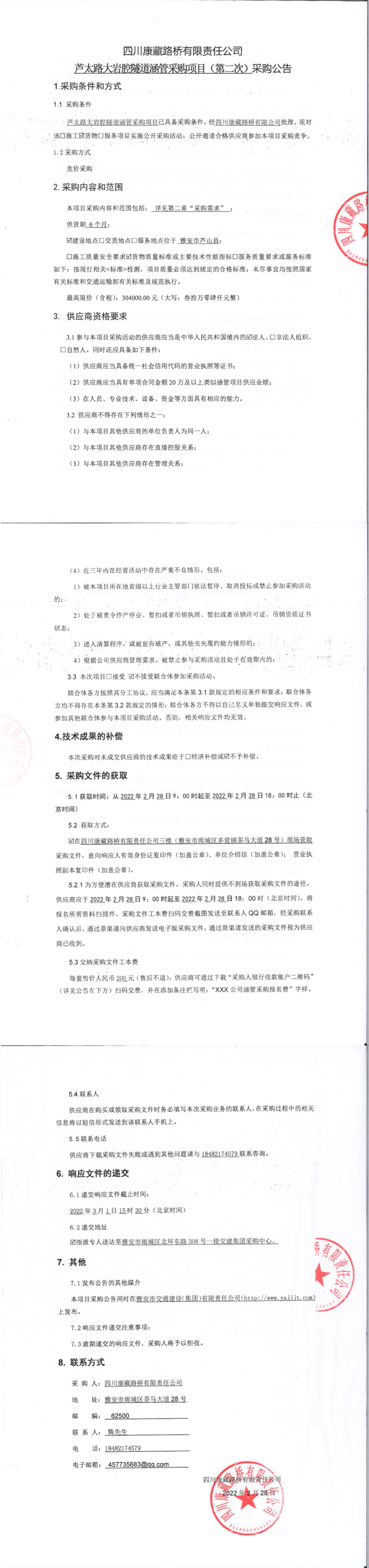 四川康藏路橋有限責(zé)任公司蘆太路大巖腔隧道涵管采購項(xiàng)目(第二次)采購公告