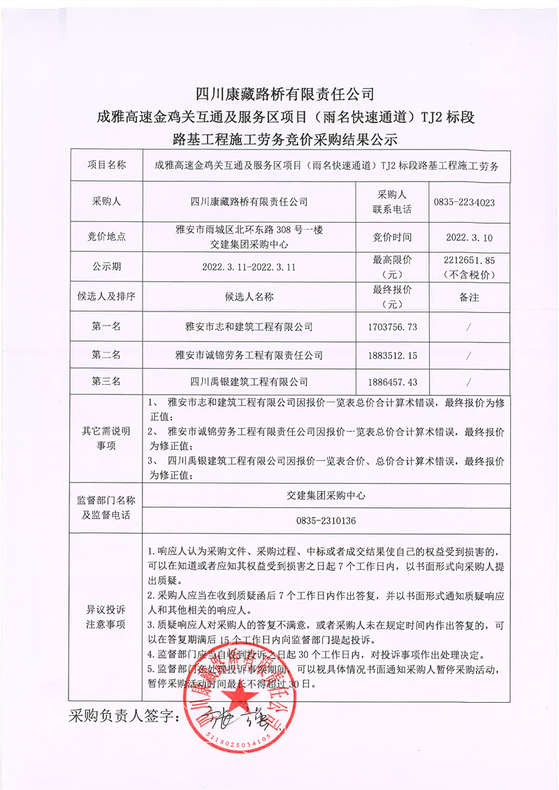 四川康藏路橋有限責任公司成雅高速金雞關(guān)互通及服務(wù)區(qū)項目(雨名快速通道)TJ2標段路基工程施工勞務(wù)競價采購結(jié)果公示