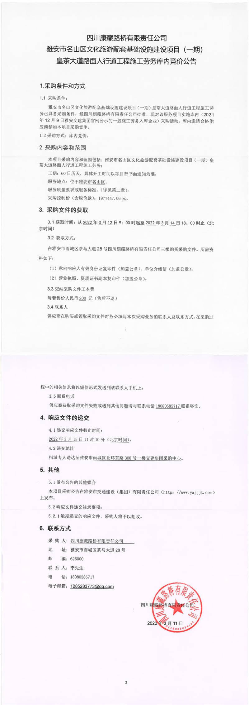 四川康藏路橋有限責任公司雅安市名山區(qū)文化旅游配套基礎設施建設項目(一期)皇茶大道路面人行道工程施工勞務庫內(nèi)競價公告