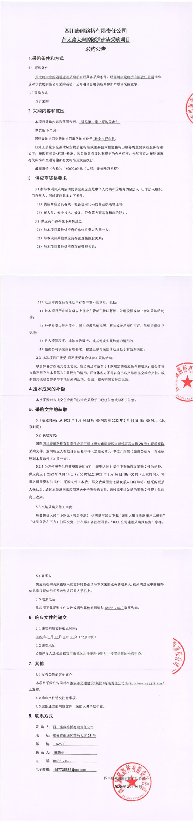 四川康藏路橋有限責任公司蘆太路大巖腔隧道建渣采購項目采購公告