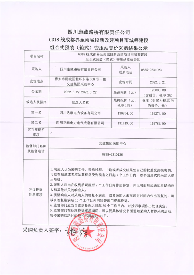 四川康藏路橋有限責(zé)任公司G318線成都界至雨城段新改建項目雨城籌建段組合式預(yù)裝(箱式)變壓站競價采購結(jié)果公示