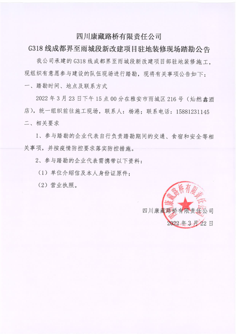 四川康藏路橋有限責(zé)任公司G318線(xiàn)成都界至雨城段新改建項(xiàng)目駐地裝修現(xiàn)場(chǎng)踏勘公告