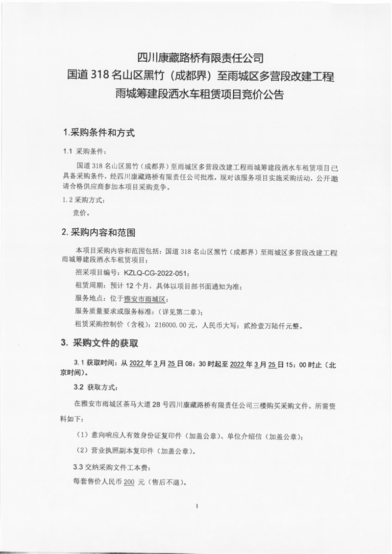 四川康藏路橋有限責(zé)任公司國道318名山區(qū)黑竹(成都界)至雨城區(qū)多營段改建工程雨城籌建段灑水車租賃項(xiàng)目競價(jià)公告