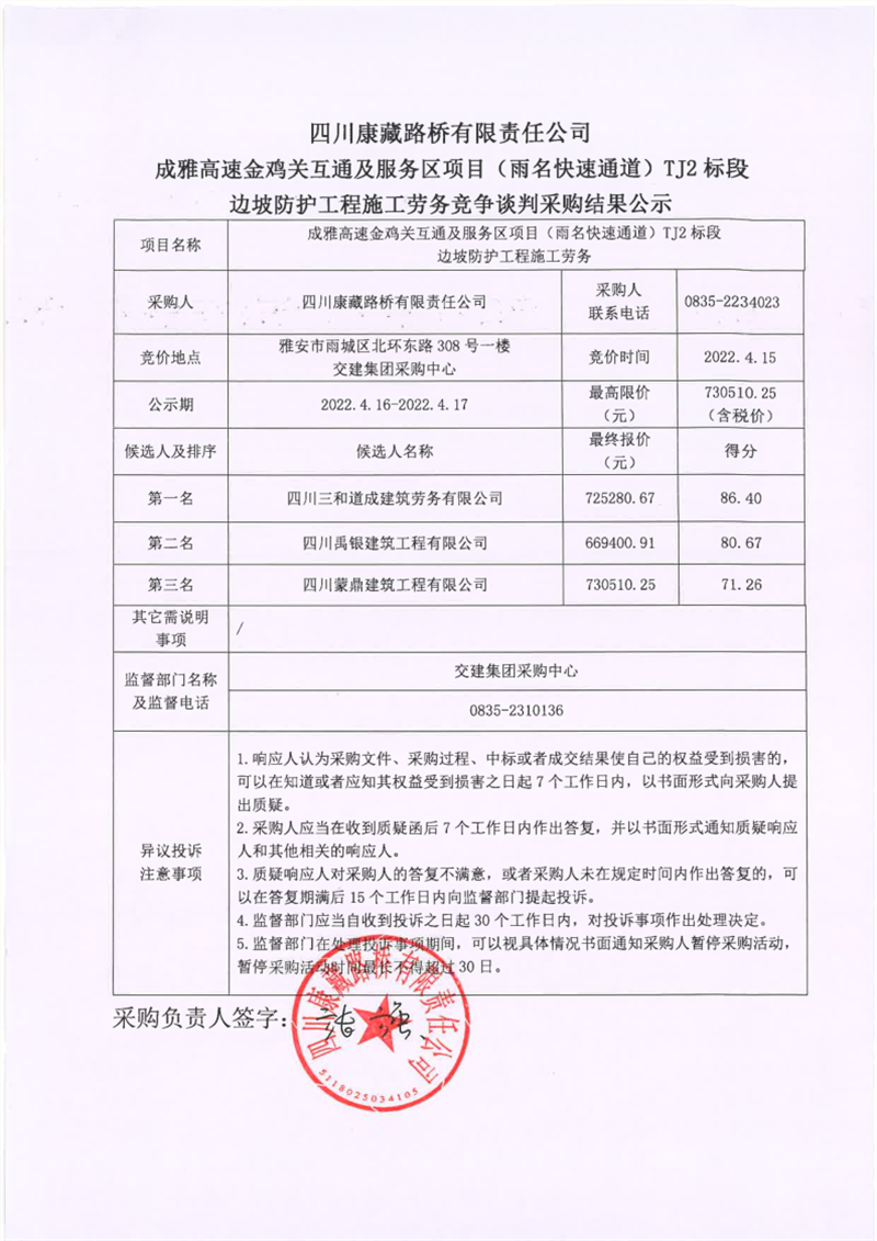 四川康藏路橋有限責任公司成雅高速金雞關(guān)互通及服務(wù)區(qū)項目(雨名快速通道)TJ2標段邊坡防護工程施工勞務(wù)競爭談判采購結(jié)果公示