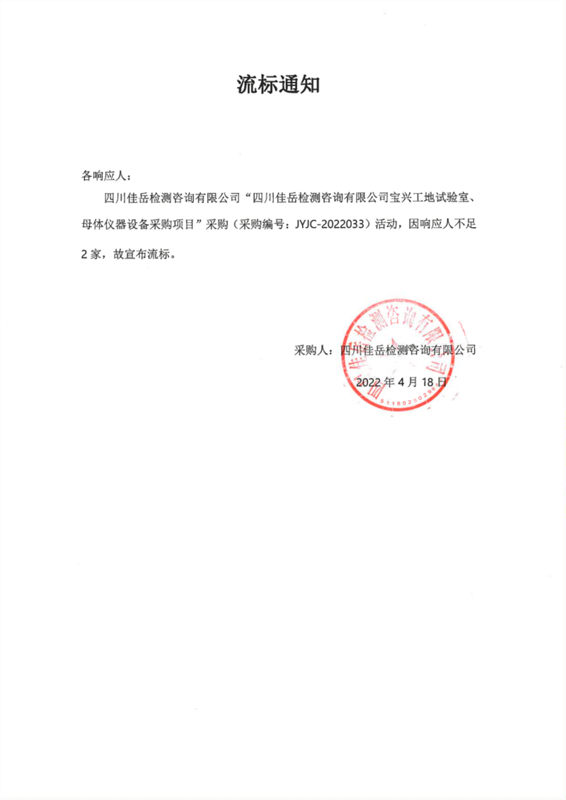 四川佳岳檢測咨詢有限公司寶興工地試驗室、母體儀器設(shè)備采購項目流標(biāo)通知