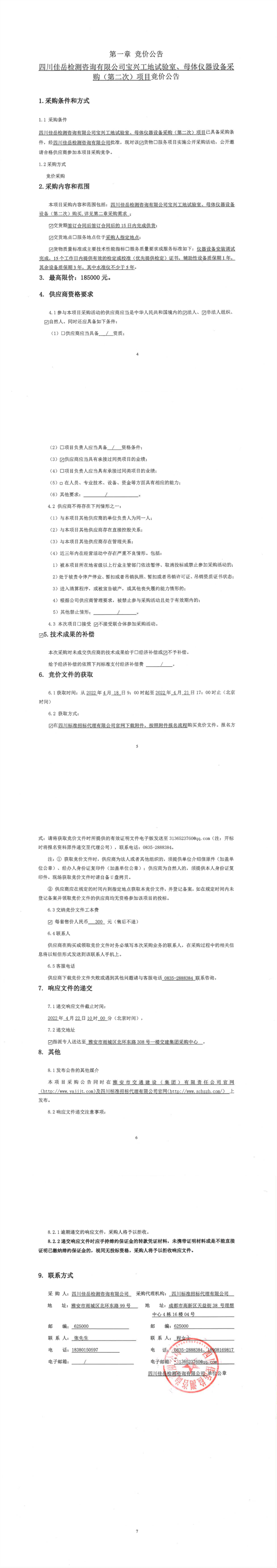 四川佳岳檢測咨詢有限公司寶興工地試驗(yàn)室、母體儀器設(shè)備采購(第二次)項(xiàng)目競價公告