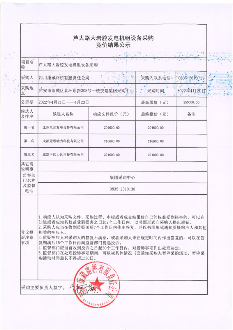 四川康藏路橋有限責(zé)任公司蘆太路大巖腔發(fā)電機(jī)組設(shè)備采購競(jìng)價(jià)結(jié)果公示