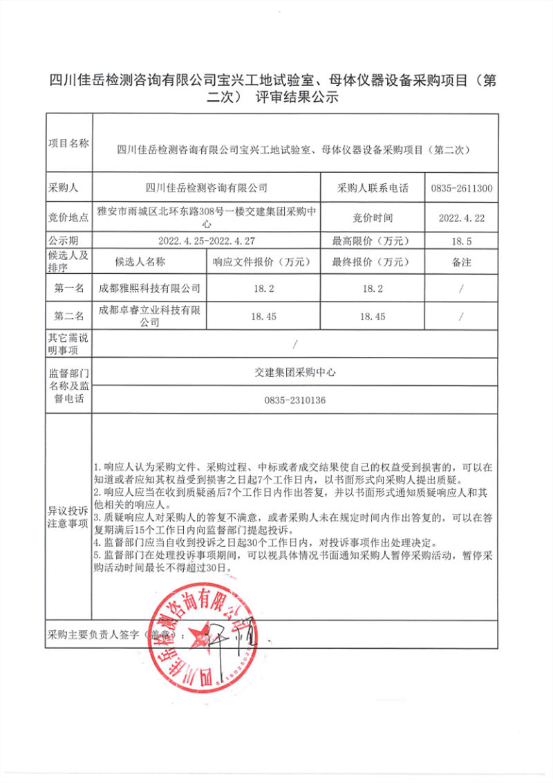 四川佳岳檢測咨詢有限公司寶興工地試驗(yàn)室、母體儀器設(shè)備采購項(xiàng)目(第二次)評審結(jié)果公示