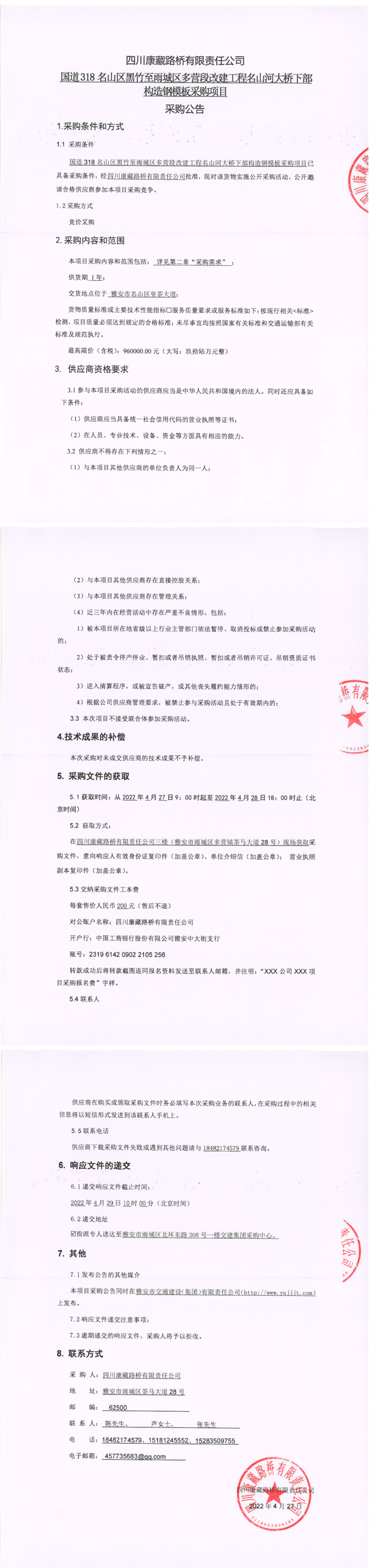 四川康藏路橋有限責(zé)任公司國道318名山區(qū)黑竹至雨城區(qū)多營段改建工程名山河大橋下部構(gòu)造鋼模板采購項目采購公告